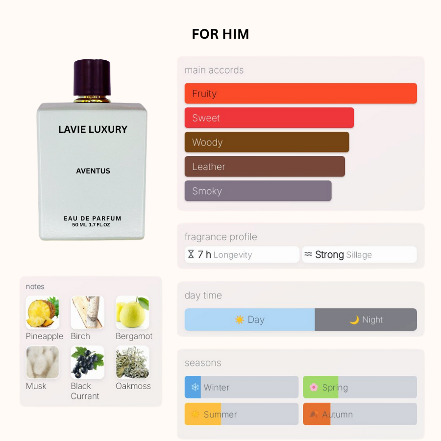 La Vie Aventus is inspired version of Aventus by Creed is a Chypre Fruity fragrance for men.Aventus was launched in 2010. Aventus was created by Jean-Christophe rault and Erwin Creed. Top notes are Bergamot, Black Currant, Apple, Lemon and Pink Pepper; middle notes are Pineapple, Patchouli and Moroccan Jasmine; base notes are Birch, Musk, oak moss, Ambroxan and Cedarwood.