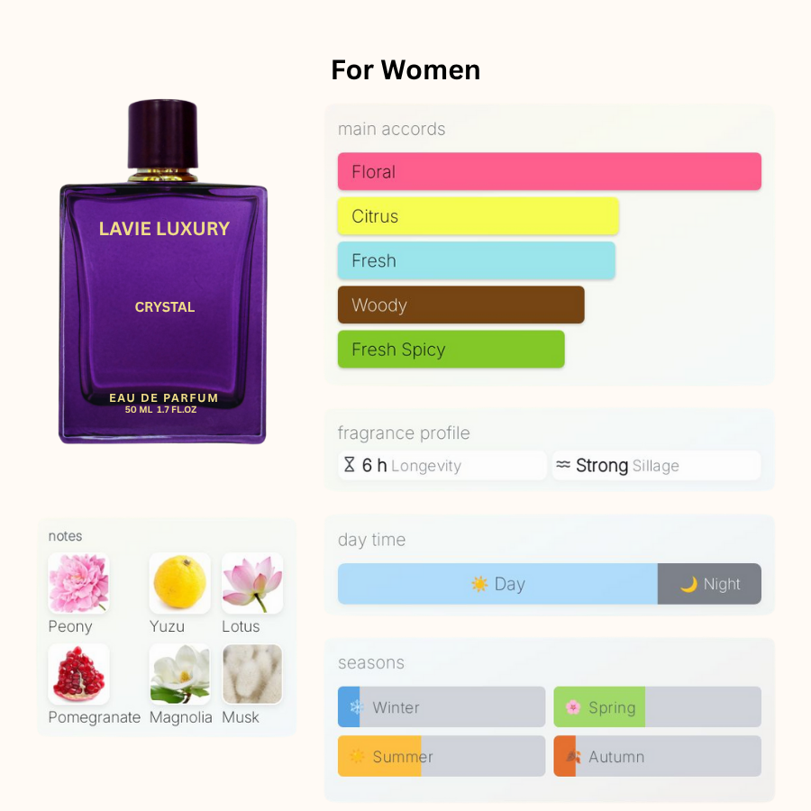 La Vie Crystal is inspired version of Bright Crystal Absolu Versace is a Floral Fruity fragrance for women.Bright Crystal was launched in 2013. The nose behind this fragrance is Alberto Morillas. Top notes are Pomegranate, Yuzu and Water Notes; middle notes are Peony, Raspberry, Lotus and Magnolia; base notes are Musk, Mahogany and Amber.