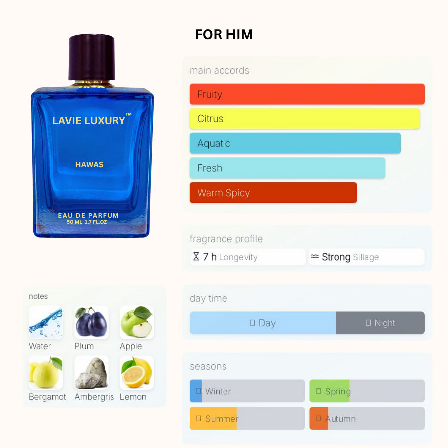 La Vie Hawas is inspired by Hawas for Him Rasasi is a Aromatic Aquatic fragrance for men.Hawas for Him was launched in 2015. Top notes are Apple, Bergamot, Lemon and Cinnamon; middle notes are Watery Notes, Plum, Cardamon and Orange Blossom; base notes are Ambergris, Musk, Patchouli and Driftwood.