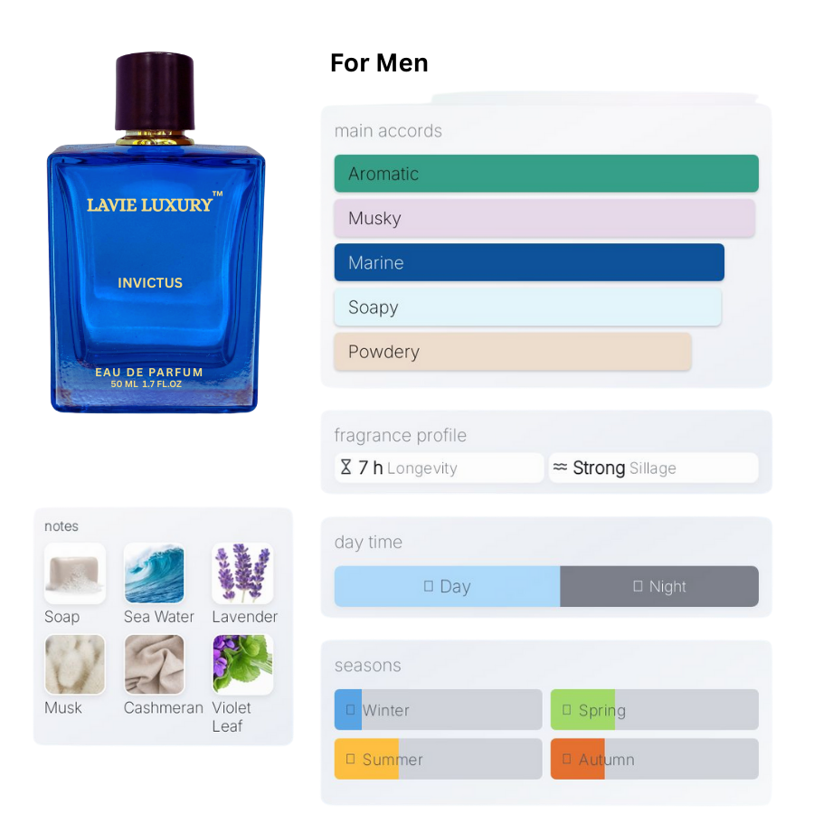 Invictus Parfum by Rabanne is a Aromatic Aquatic fragrance for men. This is a new fragrance. Invictus Parfum was launched in 2024. Invictus Parfum was created by Anne Flipo and Caroline Dumur. Top notes are Marine notes, Lavender and Pink Pepper; middle notes are Soap, Violet Leaf and Myrtle; base notes are Musk, Cashmeran and Sandalwood.