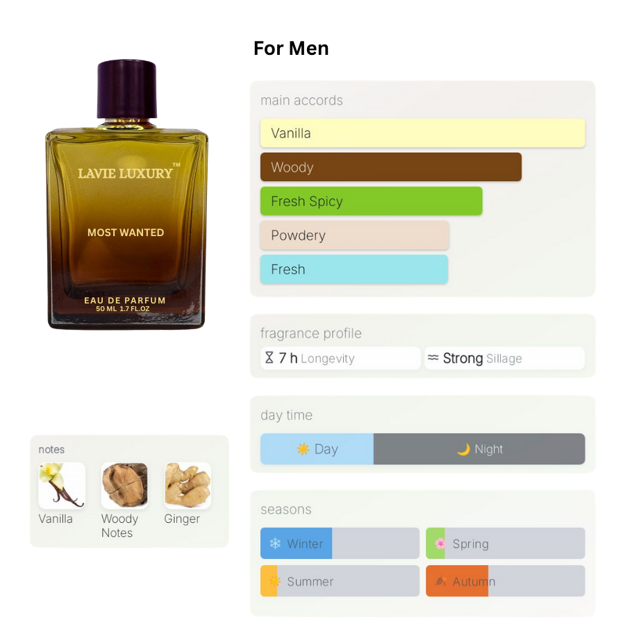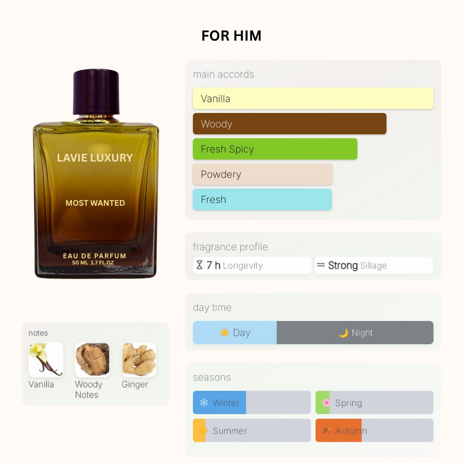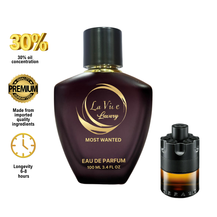 La Vie Most Wanted is inspired version of The Most Wanted Parfum. by Azzaro is a Woody Spicy fragrance for men. This is a new fragrance.The Most Wanted Parfum was launched in 2022. Top note is Ginger; middle note is Woodsy Notes; base note is Bourbon Vanilla.