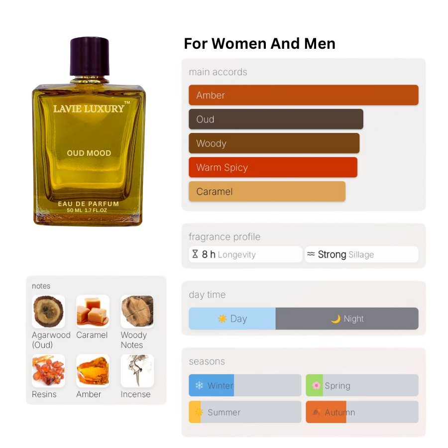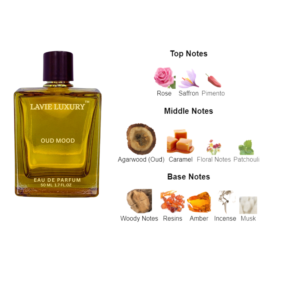 La Vie Oud Mood is a fragrance for women and men. Top notes are Rose, Saffron and Pimento; middle notes are Agarwood (Oud), Caramel, Floral Notes and Patchouli; base notes are Woody Notes, Resins, Amber, Incense and Musk.