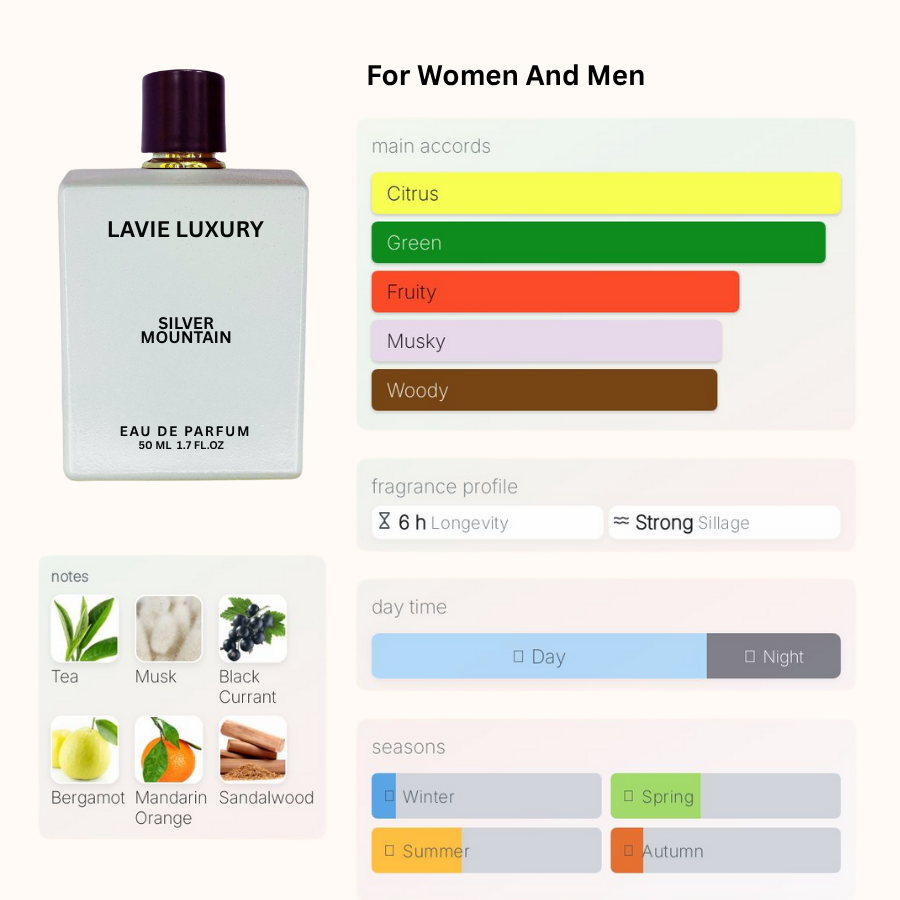 Silver Mountain Water Creed is a Aromatic fragrance for women and men. Silver Mountain Water was launched in 1995. Silver Mountain Water was created by Olivier Creed and Pierre Bourdon. Top notes are Bergamot and Mandarin Orange; middle notes are Green Tea and Black Currant; base notes are Musk, Sandalwood, Petitgrain and Galbanum