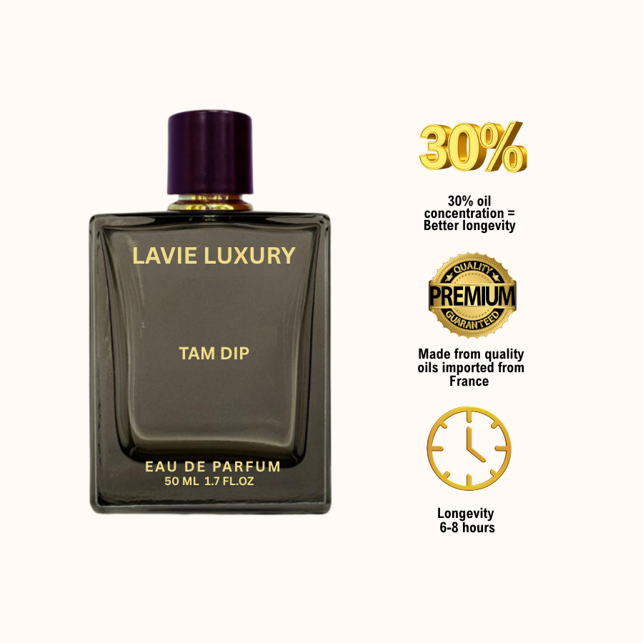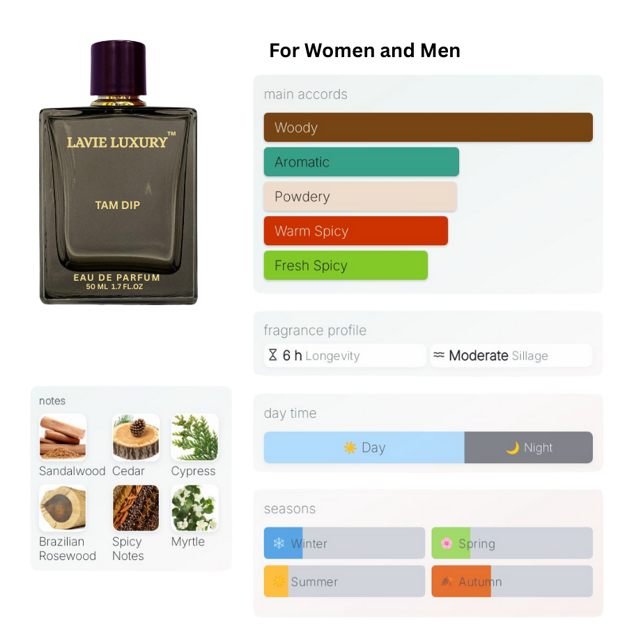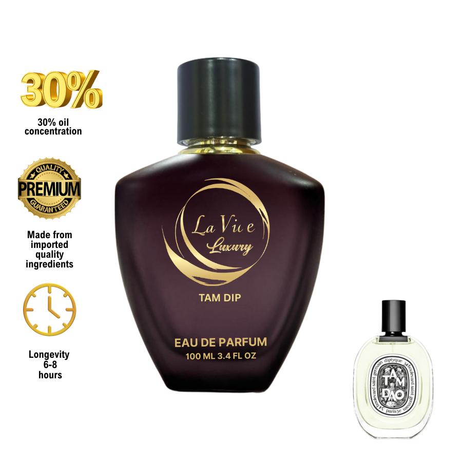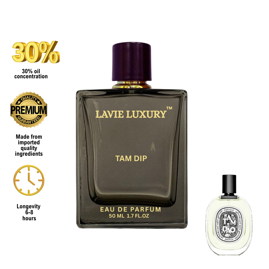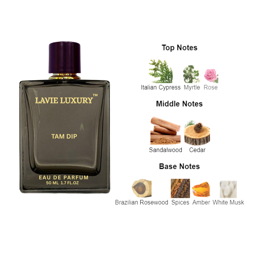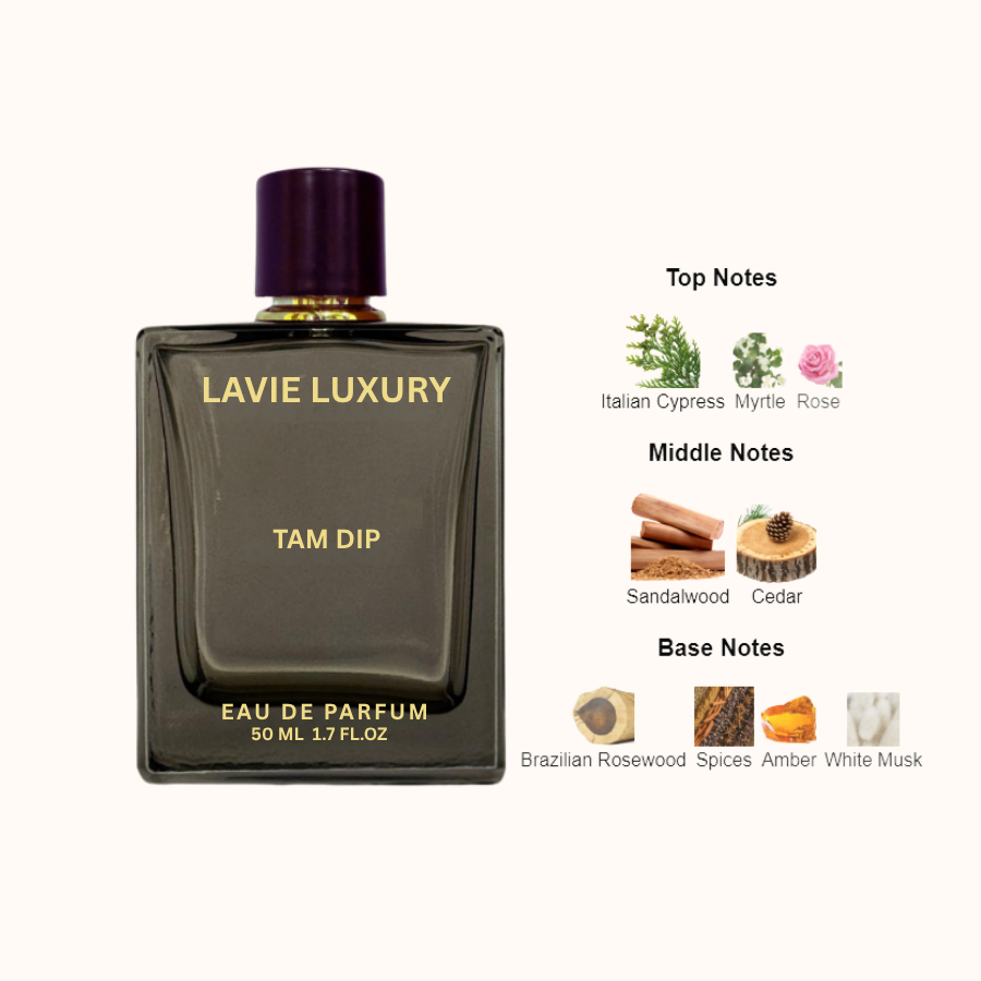 La Vie Tam Dip is Floral Woody Musk fragrance for women and men.Top notes are Italian Cypress, Myrtle and Rose; middle notes are Sandalwood and Cedar; base notes are Brazilian Rosewood, Spices, Amber and White Musk.