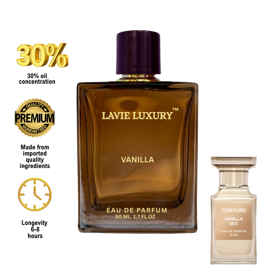 LA Vie Vanilla is inspired version of Vanilla Sex Tom Ford is a Amber Vanilla fragrance for women and men. This is a new fragrance.Vanilla Sex was launched in 2023. Top note is Bitter Almond; middle notes are Vanilla and Floral Notes; base notes are Vanilla Absolute, Ultravanil‚Äö Tonka Bean and Sandalwood.