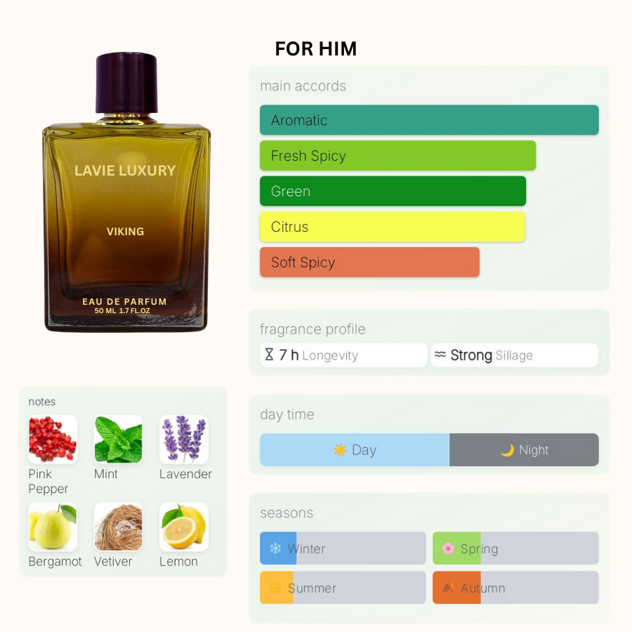 La Vie Viking is an inspired version of Viking by Creed is a Woody Aromatic fragrance for men. Viking was launched in 2017. The nose behind this fragrance is Olivier Creed. Top notes are Pink Pepper, Peppermint, Bergamot, Lemon, Absinthe and Orange; middle notes are Lavender, Bulgarian Rose, Clove, Allspice, Orris Root and Jasmine; base notes are Vetiver, Cedar, White Musk and Tonka Bean.